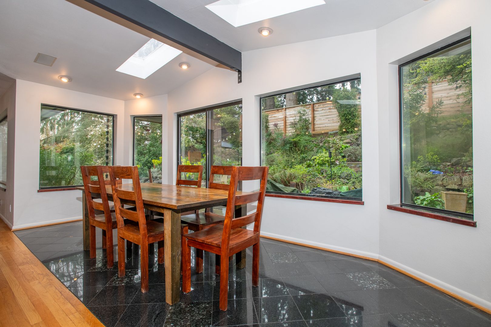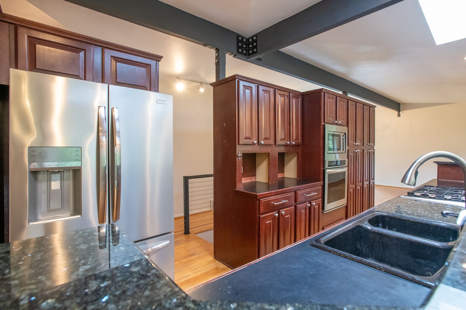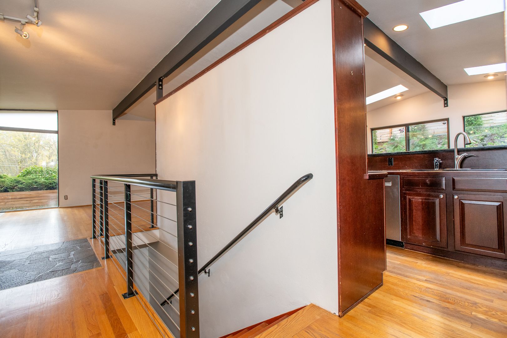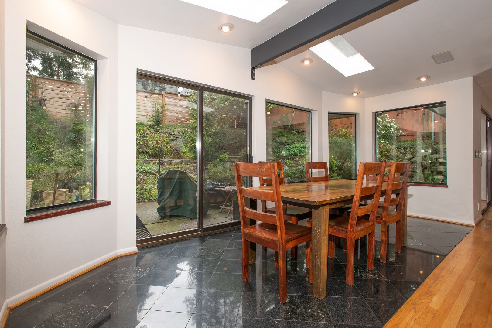 Granite gourmet kitchen opens to eating space with heated granite floor, skylites,windows,and a slider to the backyard. Cherry cabinets,oak flr, granite bar & cutting area, gas cooktop. 3BR and 2 baths on main level plus formal dining rm and living rm w/fireplace. Master bth has unique jetted soaker tub. Downstairs den/family rm w/fireplace and tile floor, large laundry/utility rm plus office/rec rm and convenient 2 car garage with shop space. One-half block from Discovery Park.