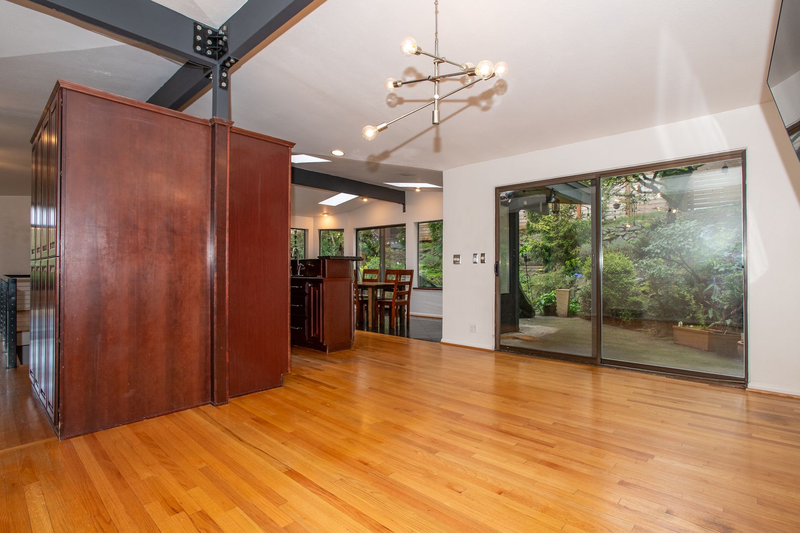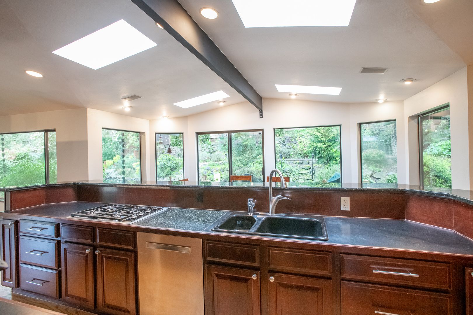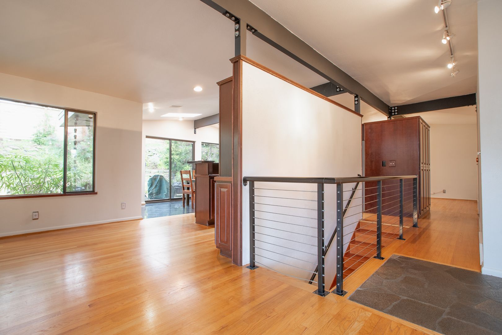 Granite gourmet kitchen opens to eating space with heated granite floor, skylites,windows,and a slider to the backyard. Cherry cabinets,oak flr, granite bar & cutting area, gas cooktop. 3BR and 2 baths on main level plus formal dining rm and living rm w/fireplace. Master bth has unique jetted soaker tub. Downstairs den/family rm w/fireplace and tile floor, large laundry/utility rm plus office/rec rm and convenient 2 car garage with shop space. One-half block from Discovery Park.